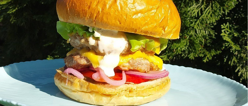 Булочка, соус часниковий, цибуля, сир чеддер х2, котлета свинячо-яловича х2, мариновані огірки, помідор, салат, американська гірчиця