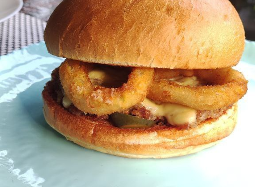Булочка, кетчуп, цибулеві кільця , сир чеддер, котлета свинячо-яловича, мариновані огірки, американська гірчиця