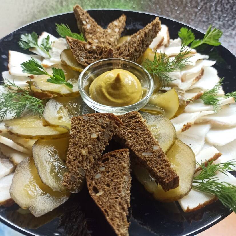 Сальце, хліб чорний, огірки мариновані, зелень, гірчиця