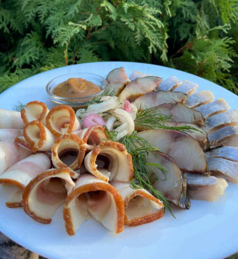 Скумбрія х/к , оселедець , сальце ,цибуля маринована, зелень , гірчиця