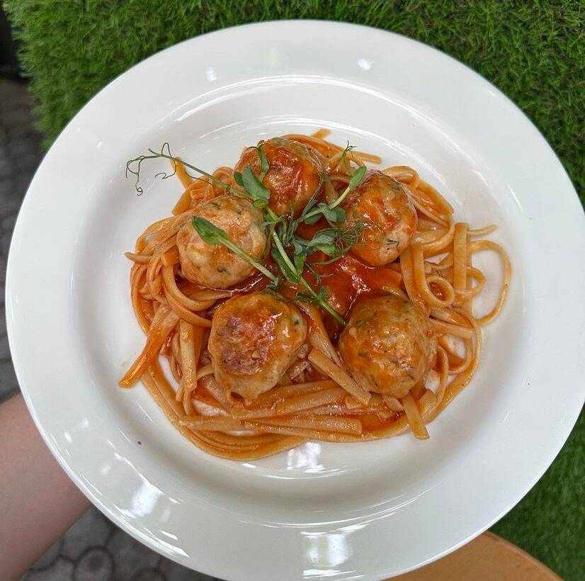 Тушковані італійські фрикадельки у томатному соусі , під сиром моцарела, подаються із пастою