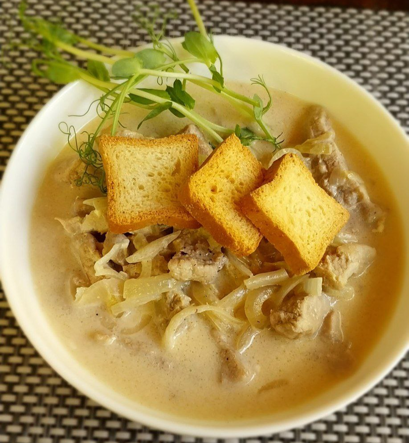 Свинина обсмажена у вершковому соусі із цибулею, подається з хлібцями.