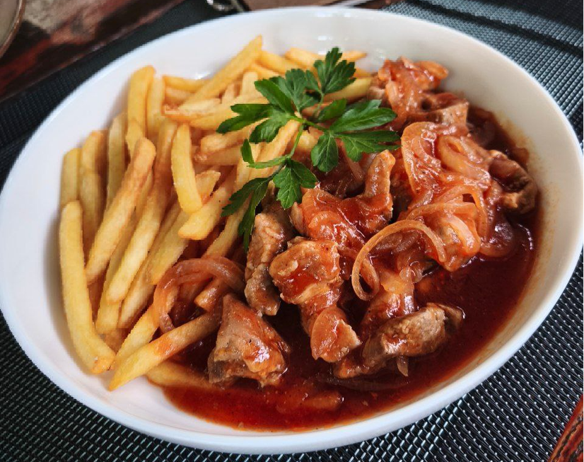 Свинина обсмажена у томатному соусі із цибулею, подається з хлібцями та картоплею фрі