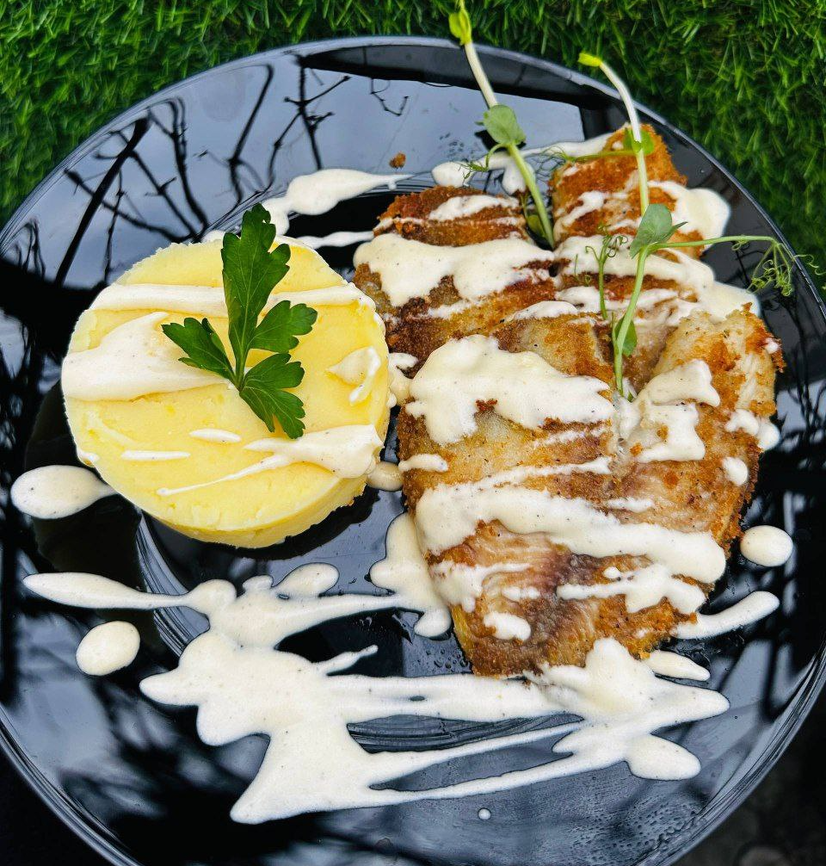 Обсмажене філе тілапії під фірмовим соусом, подається з картопляним пюре