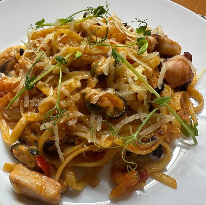 Паста з морепродуктами та сиром пармезаном