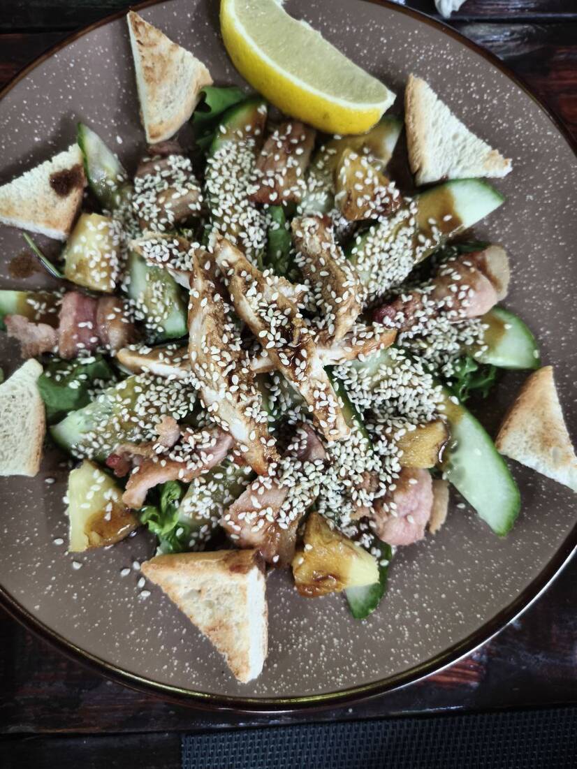 Мікс салату , помідор, сир пармезан, перепелині яйця , куряче філе , смажені хлібці , соус , кунжут
