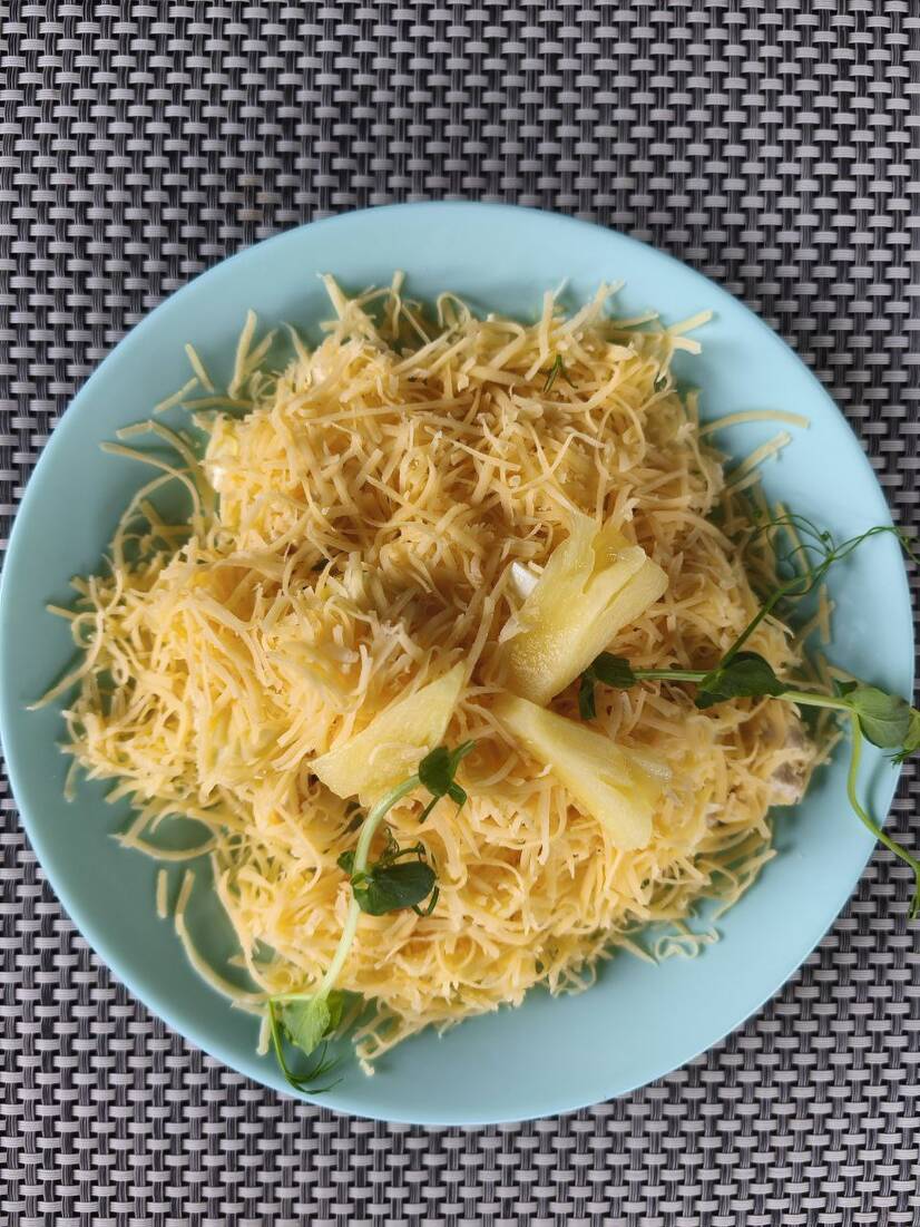 Куряче філе , ананас консервований, яйце , сир твердий, часник , майонез