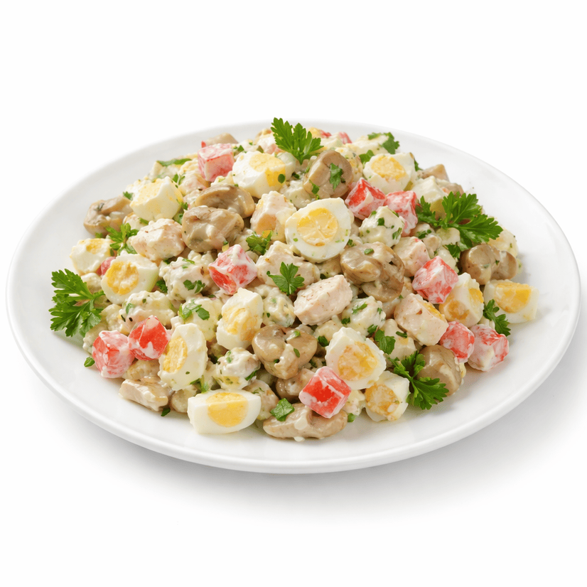 Куряче філе , яйце куряче ,крабові палички, гриби мариновані , петрушка, майонез