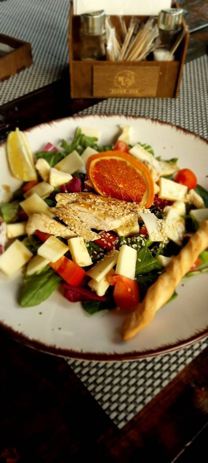 Мікс салату , помідор,куряче філе , сир брі , сир твердий, соус ,кунжут