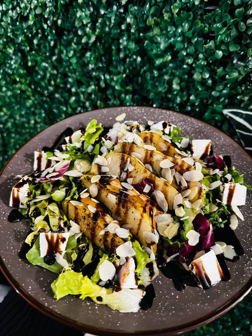 Мікс салату , карамелізована груша, куряче філе , сир фета,мигдальні пластівці , соус