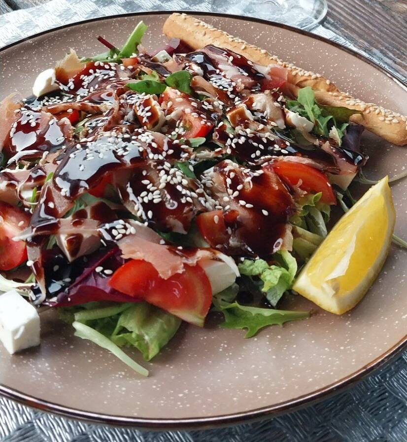 Мікс салату , сир фета,маслини, помідор, хамон,соус ,кунжут