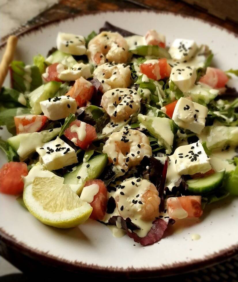 Мікс салату , креветки, помідори,сир фета, огірок , кунжут, соус