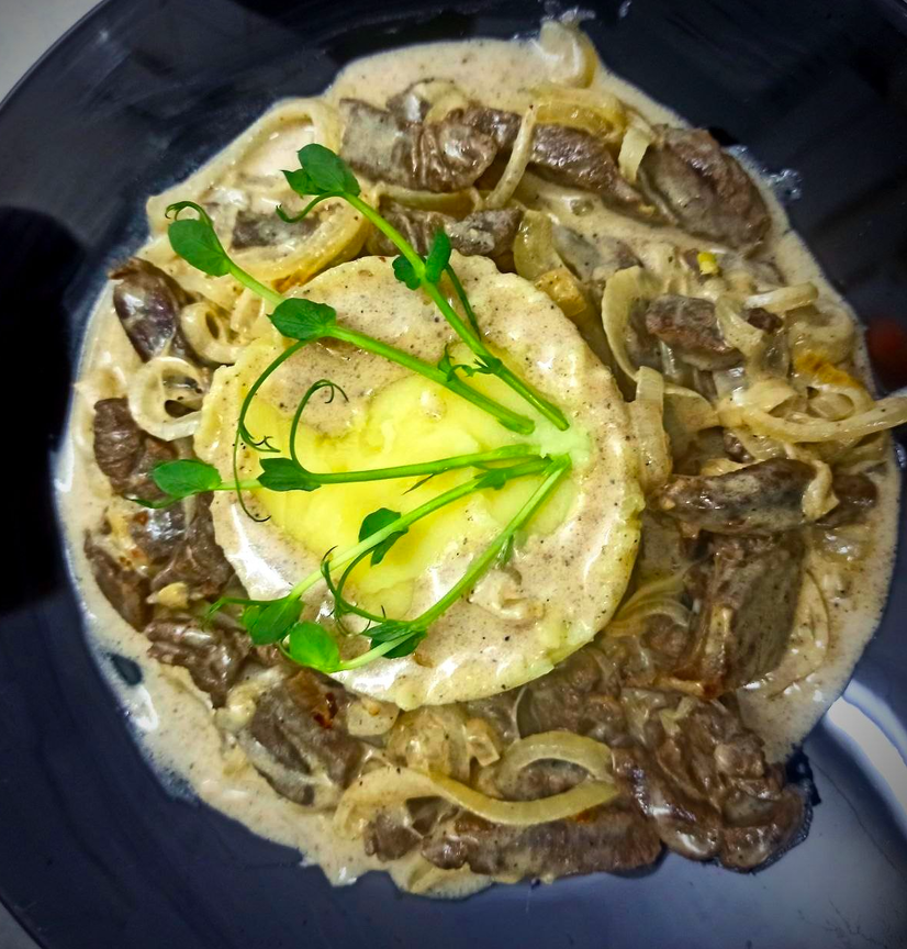 Білий Лев Бефстроганів із косулі з картоплею пюре
