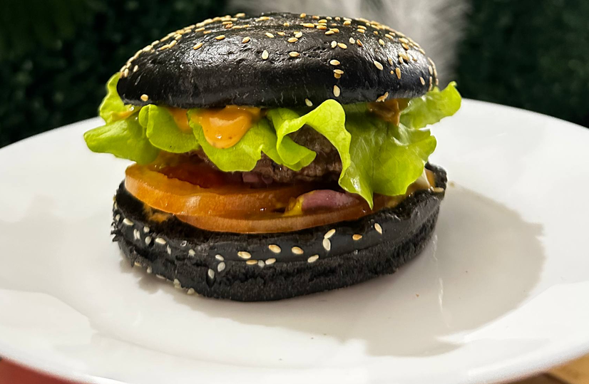 Булка чорна, біфштекс рублений з яловичини, салат, сир чеддер, цибуля, огірки мариновані, помідор, американська гірчиця, соус