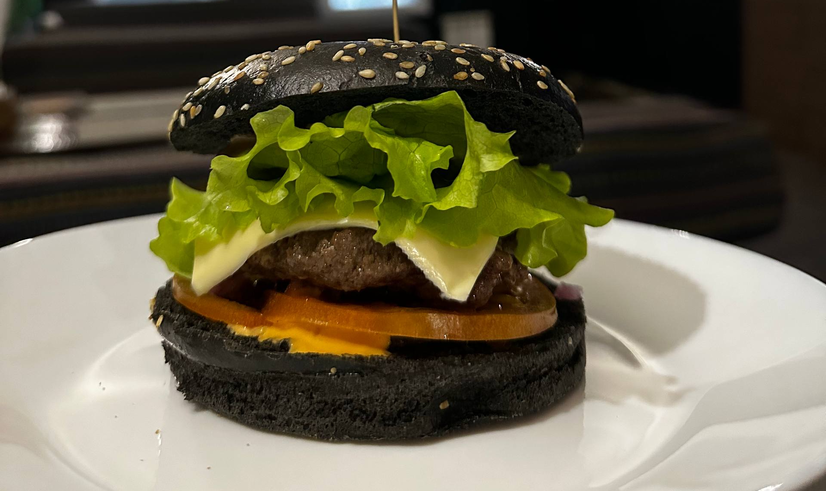 Булка чорна, біфштекс з страуса, салат, сир чеддер, цибуля, огірки мариновані, помідор, американська гірчиця, соус