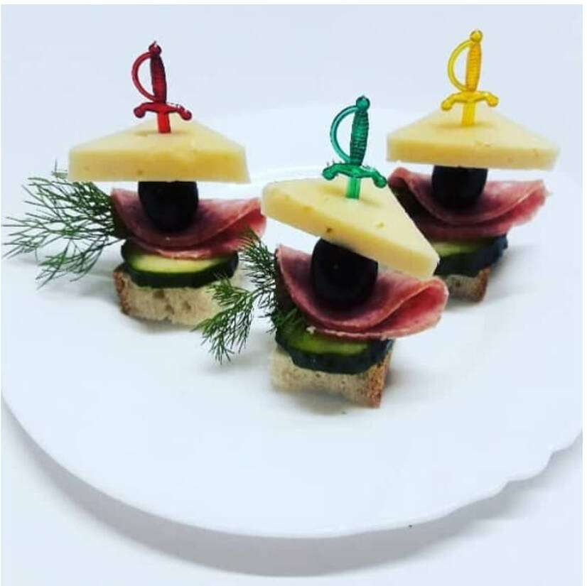 Грінка, огірок, салямі, маслина, сир твердий