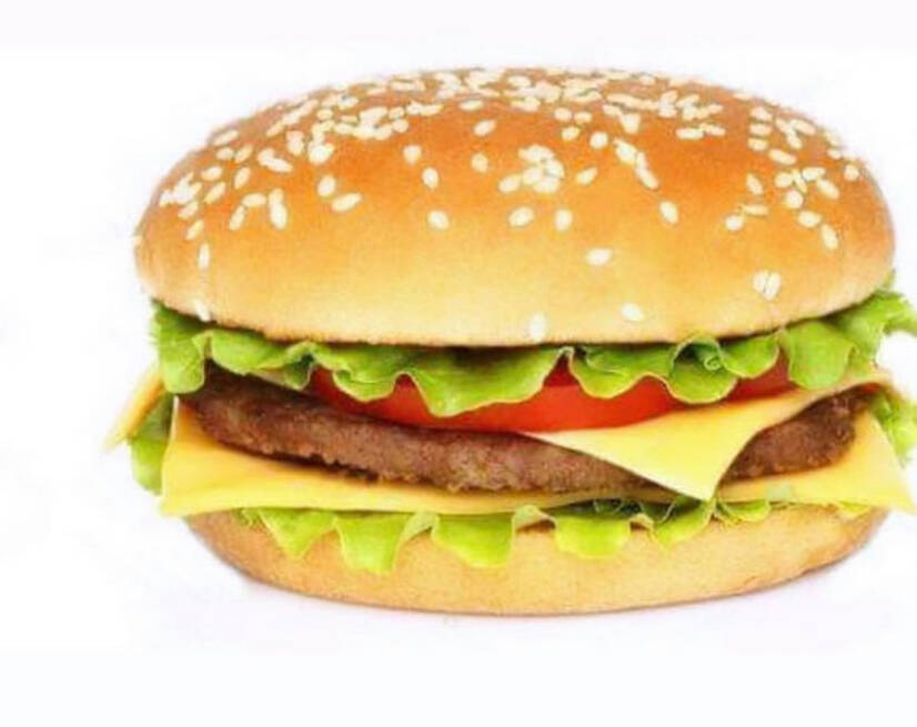Булка, соус сирний, помідор, сир чеддер, лист салату, котлета з яловичини, сир твердий