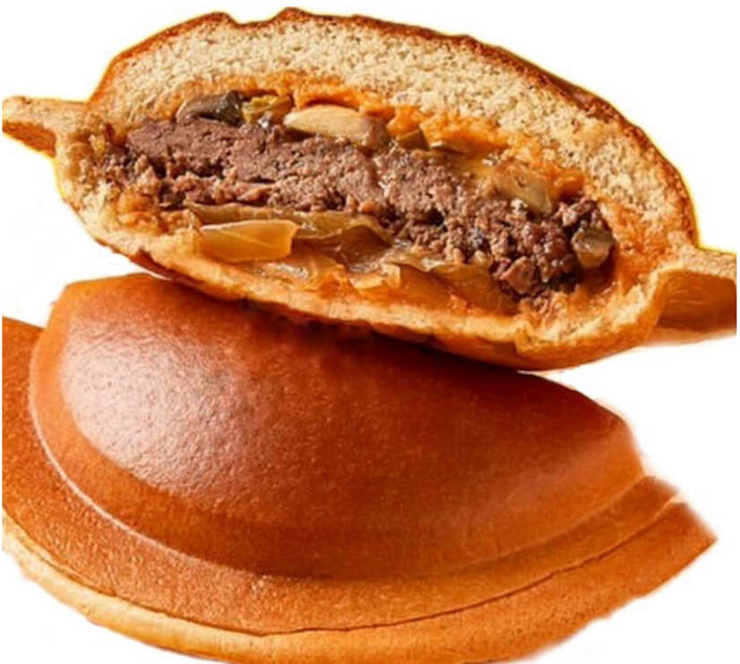 Булка Бріош, печериці, карамелізована цибуля, перець гострий, солоний огірок, яловича котлета, сир чеддер