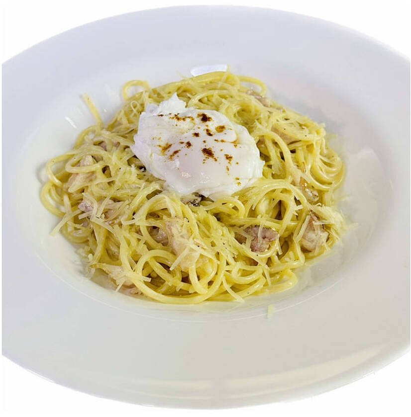 Вершковий соус, бекон, сир пармезан, яйце пашот
