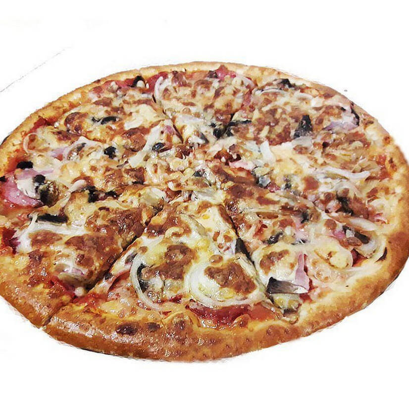 Томатный соус, шинка, салямі, папероні, печериці, цибуля, сир твердий, моцарелла