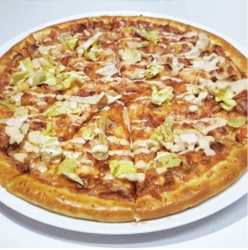 Томатний соус, бекон, куряче філе, пармезан, моцарелла, айсберг, соус Цезар