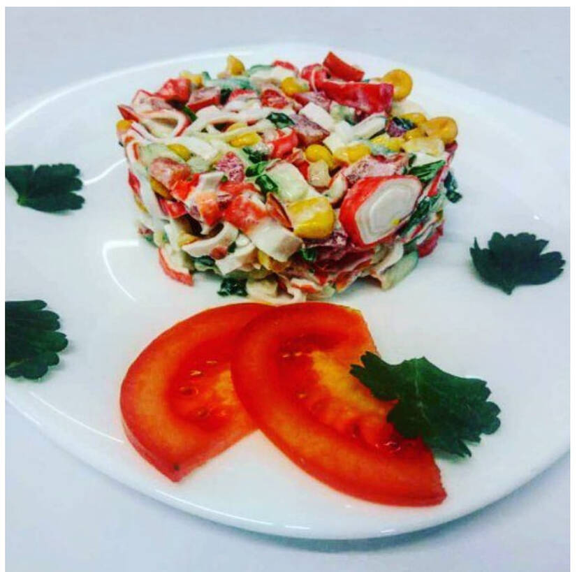 Крабові палички, огірок, томати, цибуля зелена, кукурудза, соус