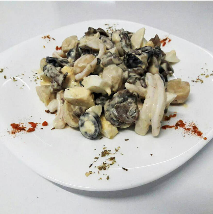 Гриби мариновані, гриби смажені, кальмар, яйце відварне, маслини, соус