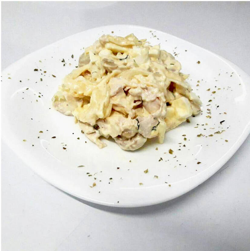 Куряче філе, яйце відварне, сир твердий, соус, гриби та цибуля мариновані