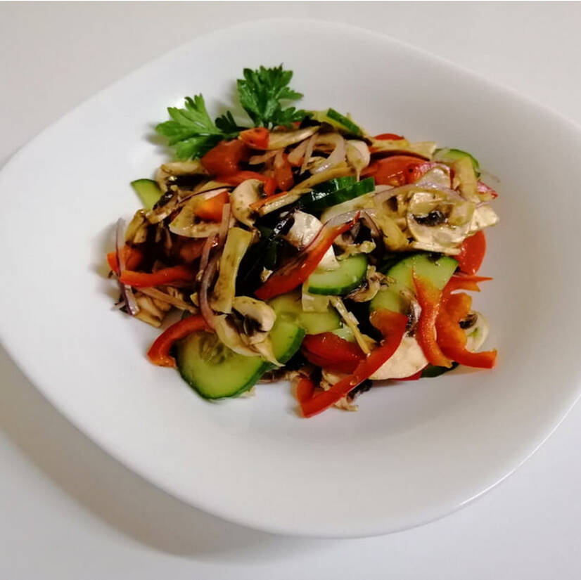 Гриби свіжі, томати, огірок, перець солодкий, цибуля червона, оливкове масло, орегано