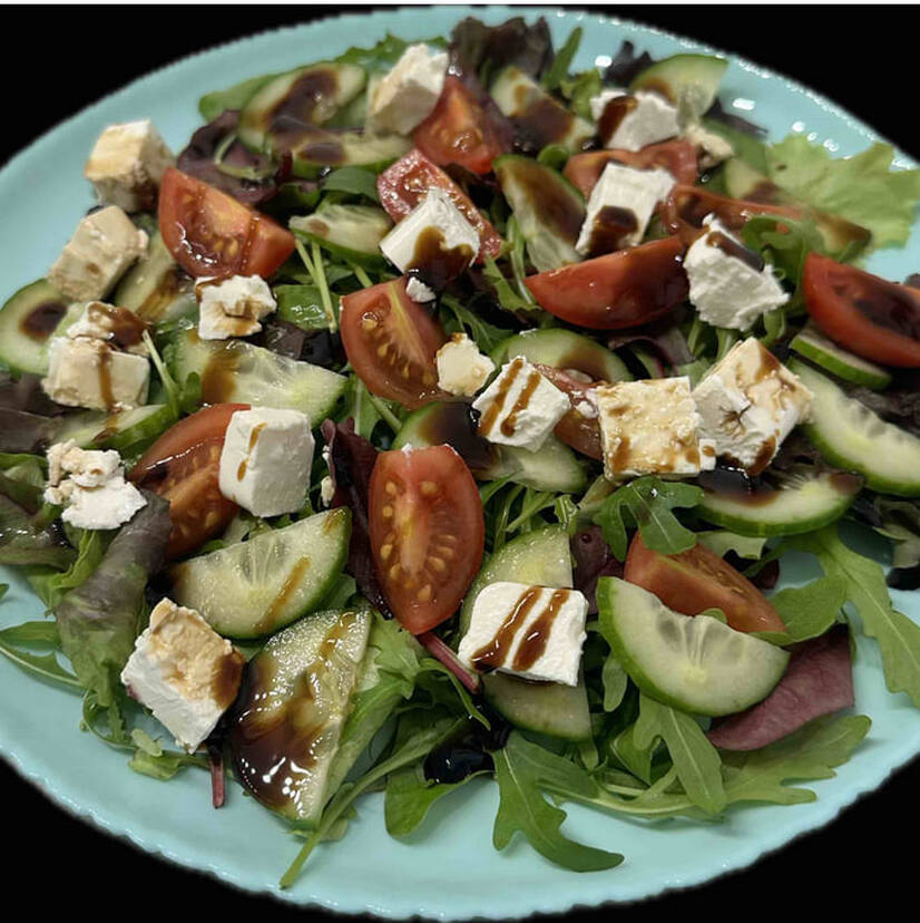 Свіжий салатний мікс із хрумким огірком та коктейльними томатами, доповнений сиром Комо і вишуканою заправкою на основі соусу теріякі та соєвого соусу.