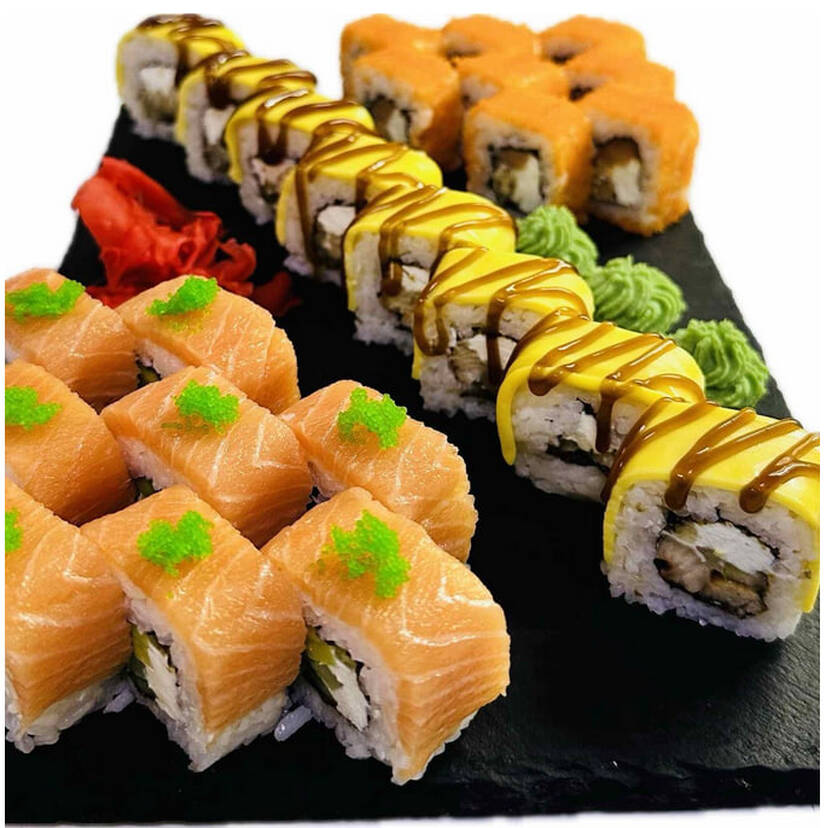 Чіз з вугрем та грушею (рис, сир, вугор, груша, сир чеддер, соус унагі) Філадельфія з лососем та авокадо (рис, сир, лосось, авокадо, огірок, тобіко) Сенсей рол (рис, сир, лосось, мідії, тобіко)