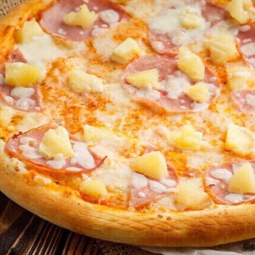 Томатний соус , копчена куряча грудка , ананас , кукурудза, томати , моцарела та часниковий соус. Легка піца з яскравим смаковим акцентом.