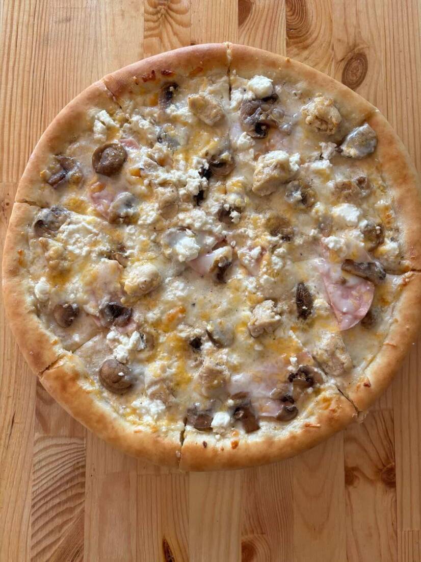 Вершковий соус , шинка , ніжна курочка у вершковому соусі , гриби , сир фета та моцарела з ароматним часниковим соусом. М'який і кремовий смак.