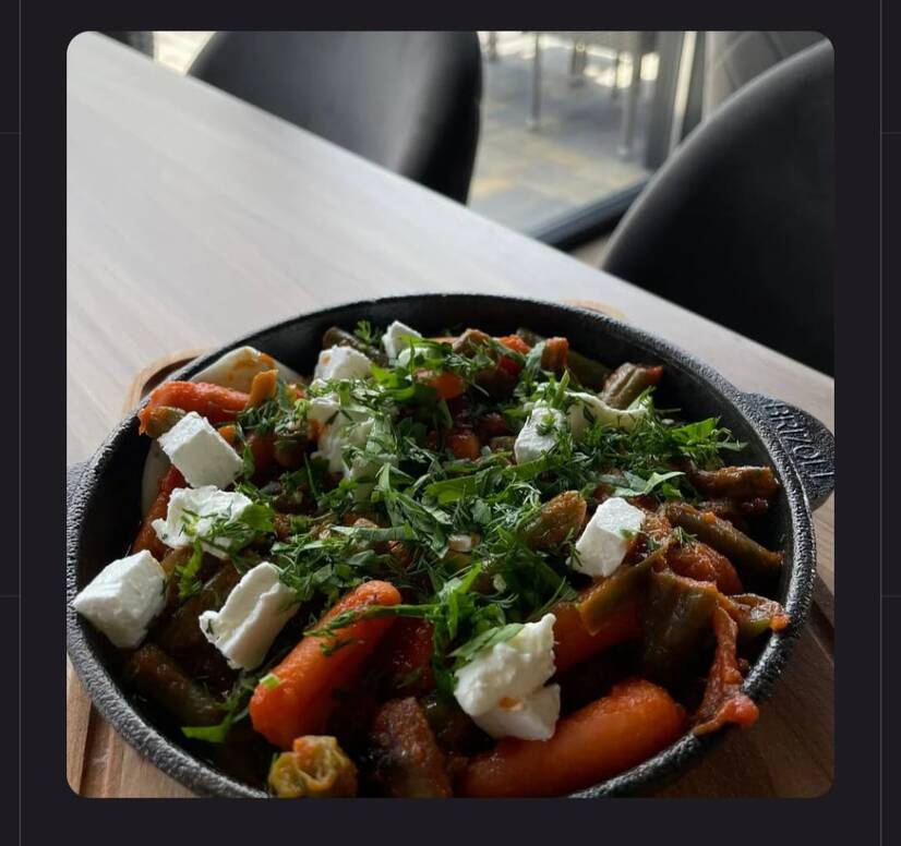 Куряче яйце, фірмовий червоний соус, сир фета, грецький йогурт, болгарський перець, морква, спаржева квасоля, печериці.