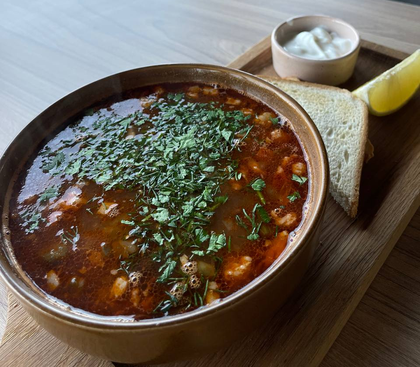 Склад: томатна паста, сметана, хліб, каперси, цибуля ріпчаста, куряче філе, солоний огірок і неймовірний мікс найкращих ковбас.