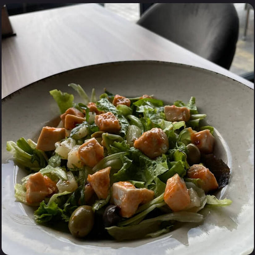 Склад: куряче філе, ананас, маслини, оливки, фірмовий салатний соус, моцарела, солодкий чилі, мікс салату.