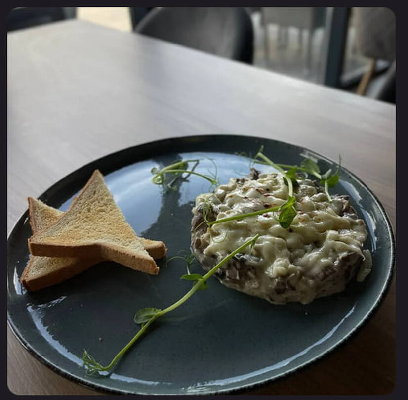 Склад : куряче філе, моцарела, вершки, спеції, цибуля ріпчаста, печериці, тости