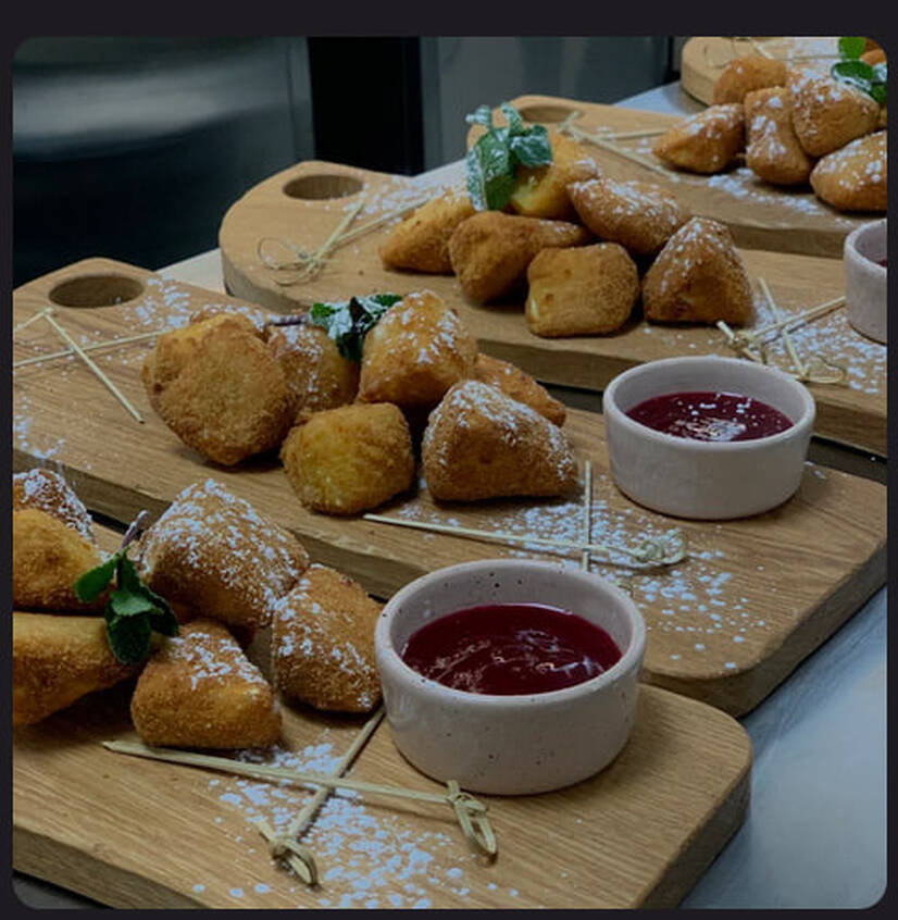 Склад : сир брі, сухарі панко, борошно, куряче яйце, топінг